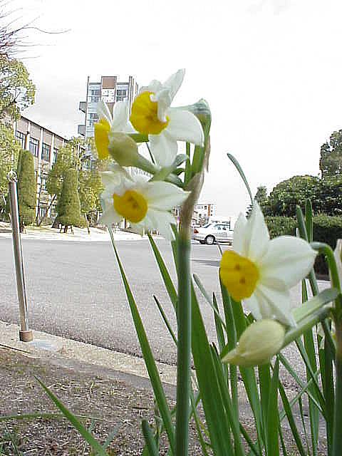 時計台近くの水仙。今が見頃。このほかにも大学構内各所に水仙が植えられているが、残念なことに、咲きかけの蕾を切り取って持ち去る人がおり、殆ど花を咲かせないままに春を迎えようとしている。 |