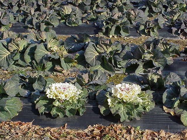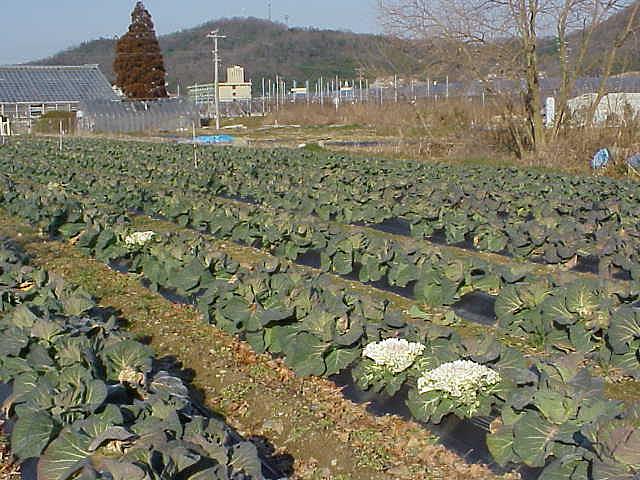 農学部農場のキャベツ畑の中に、なぜか葉の色の違う株があった。突然変異なのか? それとも何かの実験のためなのだろうか。 |