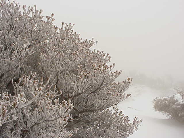 鶴見岳頂上付近。朝、宿舎の窓から見た鶴見岳が真っ白になっていたので、予定を変更してロープウェイで頂上に。霧氷を期待していたのだが、頂上付近は猛吹雪で、頂上駅出口から10mほど進むのがやっとだった。帰り際には麓の駅でもみぞれが降る始末。 |