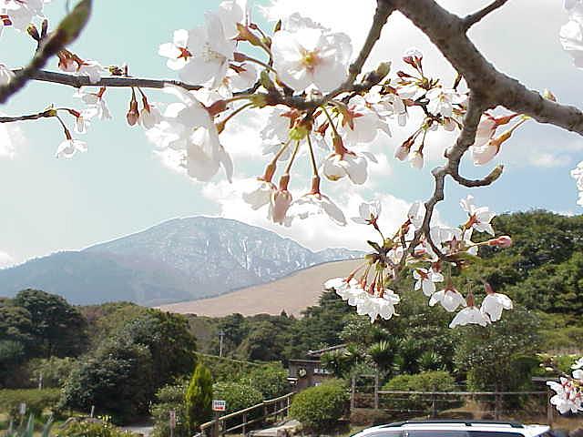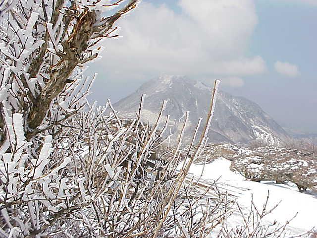 前日は吹雪で何も見えなかったため、4/1朝に再度、鶴見岳に登った。期待通りの雪景色。隣の由布岳(写真左)の雪化粧の様子も間近に眺めることができた。写真右は鉱泥温泉(坊主地獄の隣)から眺める鶴見岳。 |