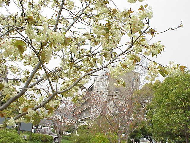 鬱金桜と文学部。このところ、毎夕のように桜の木の下で学生達のコンパが開かれている。岡山駅の近くにありながら自然豊かな環境にめぐまれ、自前の桜で楽しめるのが岡大の良いところであるが、ゴミの後始末と「アルハラ(=アルコール・ハラスメント)」には注意しよう。 |