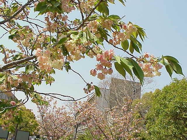 文学部前の鬱金桜が、鬱金色からピンク色に色づいてきた。右は4/14撮影のもの。 |