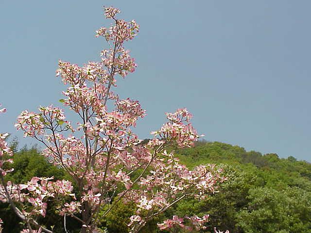 ハナミズキ。背景は半田山の新緑。右は昨年11/30に撮影した同じ木の写真。 |