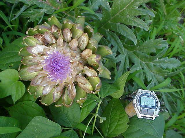 アーティチョークの花がやっと開き始めた。6/13の日記で、花の形が全然違うようだと書いたが、じつは、あの時はまだ蕾。いま開き始めたのが本物の花ということになるようだ。大きさ比較のため、横に腕時計を置いてみた。 |