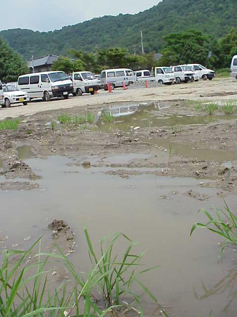 毎年、大学構内の空き地の水たまり(写真左、6/29撮影)でオタマジャクシが生まれる。今年はここ数日35度を超える炎天が続き、写真右のように殆ど干上がってしまった。7/3の夕刻に、生き残ったオタマジャクシを近くの池に無事移し替えた。夕刻とは言え、大学の教員が水たまりでオタマジャクシをすくっている姿はあまりカッコイイものではない。 |