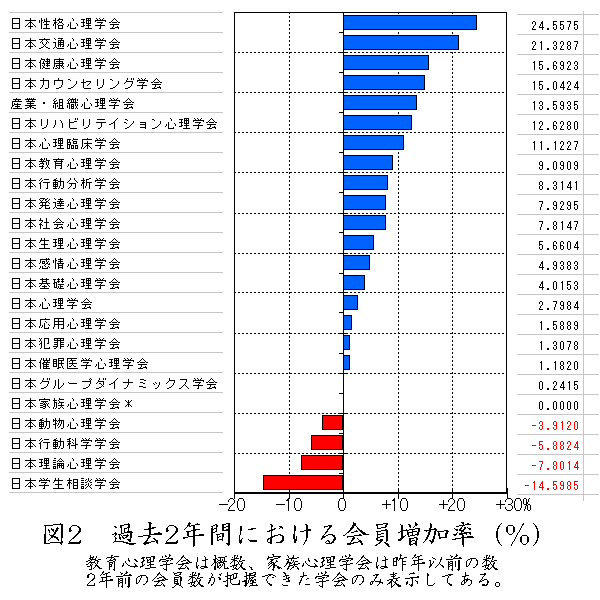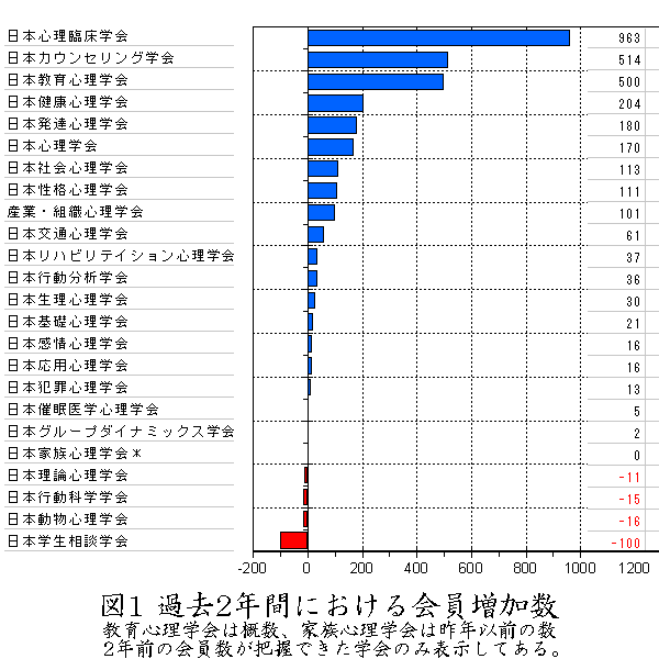 【思ったこと】 _10805(日)[心理]心理学諸学会の「盛衰」/学会の役割について考える 99年7月27日の日記で、日本心理学諸学会連合(日心連)に入会している30学会のうち、5/15現在で会員数の報告のあった24学会の会員数をグラフ化したことがあった。今回、2001年5月19日現在の会員数の報告をもとに、それら各学会の会員数がどれだけ増えたのか調べてみた。なお、8/1の日記にも記したとおり、日心連に加入している学会数は現在は38学会となっている。グラフ化したのは、2年前と比較ができた24学会に限られている点にご留意願いたい。 まず、会員の増加数を図1に示す。グラフによれば、増加数がいちばん多いのは、日本心理臨床学会、ついで日本カウンセリング学会、日本教育心理学会、日本健康心理学会、日本発達心理学会、日本心理学会.....という順になっている。今回比較ができた24学会のうち、増加数が3ケタ以上であったのは9学会、4学会は減少、10学会は1〜2ケタの微増、日本家族心理学会は昨年度以前のデータということなので正確な比較はできなかった。 このグラフから非常に特徴的な点が読みとれる。それは、いま述べた上位6学会がいずれも、学会独自(もしくは関連する認定協会)で資格を認定している(計画中を含む)ことである。具体的には