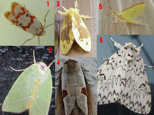 神郷町の山の家で撮影した蛾のコレクション。写真1は「アカスジシロコケガ」。幼虫は名前の通り地衣類を食べるらしい。写真6はキシタバの仲間。それ以外は不明。どなたかお教えいただけければ幸いです。 |