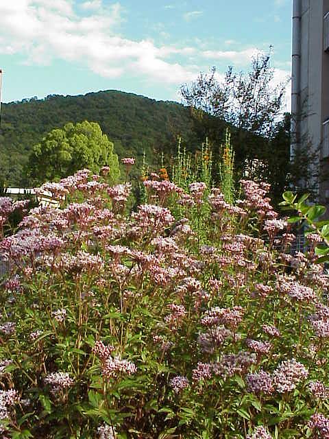 どこかの高原風景のように見えるが、右端に見えるのが文学部。後ろの半田山が借景になっている。 |