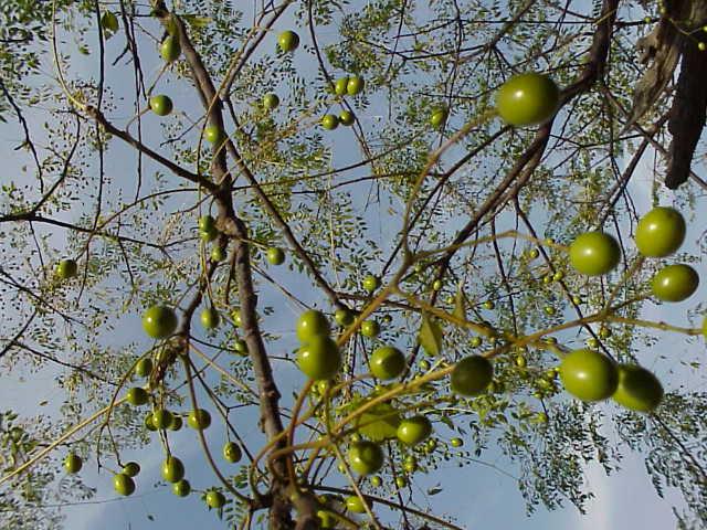 センダンの実。空から緑色の雨粒が落ちてくるような感じ。 |