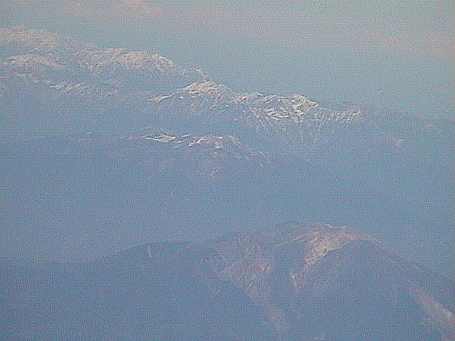 羽田〜岡山の機上から眺めた御嶽(手前)、乗鞍、北アルプス。積雪は少な目。 |