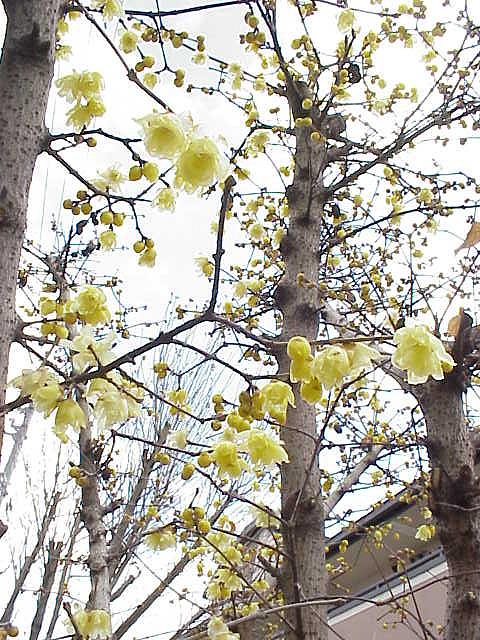 大学近く、座主川沿いのロウバイの花。下から見上げるように眺めると美しい。 |