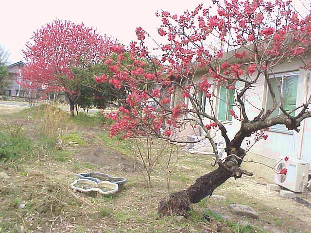 実験室前の親子の桃が咲きそろった。手前が母親。数年前に枝の半分が枯れてしまったが、朽ちた幹からなんとか花を咲かせている。その桃の実が落ちて育ったのが奥にある木。高さ5m以上の大樹となった。 |