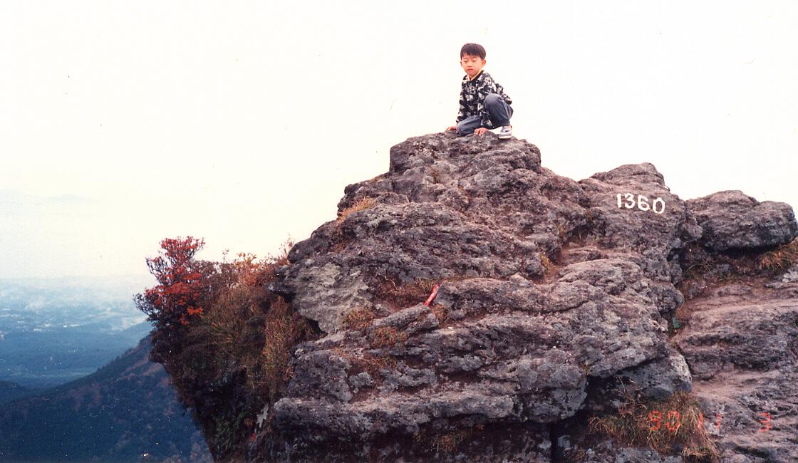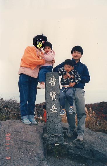左の写真は、1990年11月3日に家族で雲仙普賢岳に登った時の写真である。右は、普賢岳の最高地点1360メートルの岩の上に息子がよじ登っているところ。
