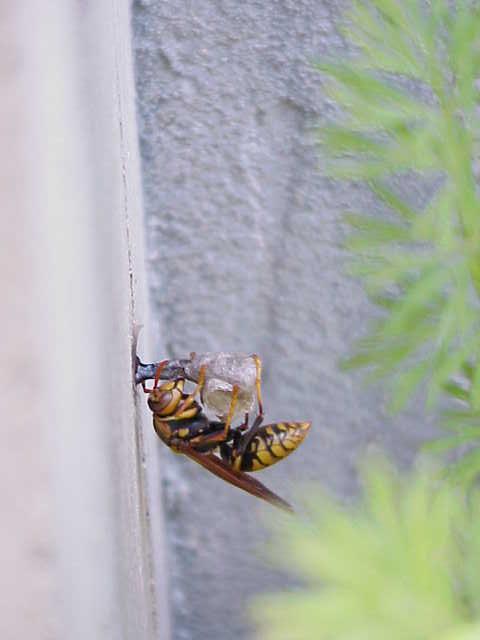 3/21の日記で復活の様子をお伝えしたアシナガバチが、巣作りを始めた。近くの枯れ草の茎をカリカリと噛んで、何かを運んでいた。 |