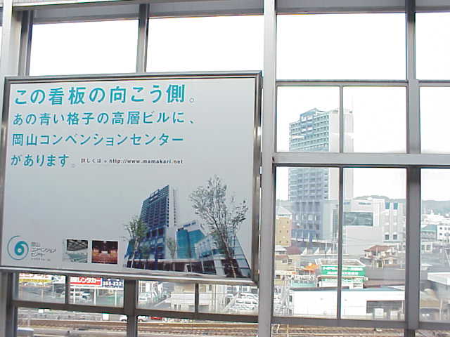 エイプリルフール企画。新幹線・岡山駅の看板をマグリット風に修正してみた(左)。元の看板は右の写真。 |