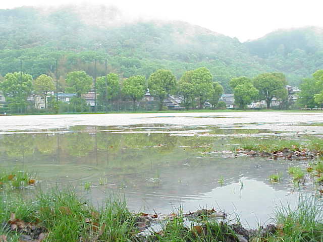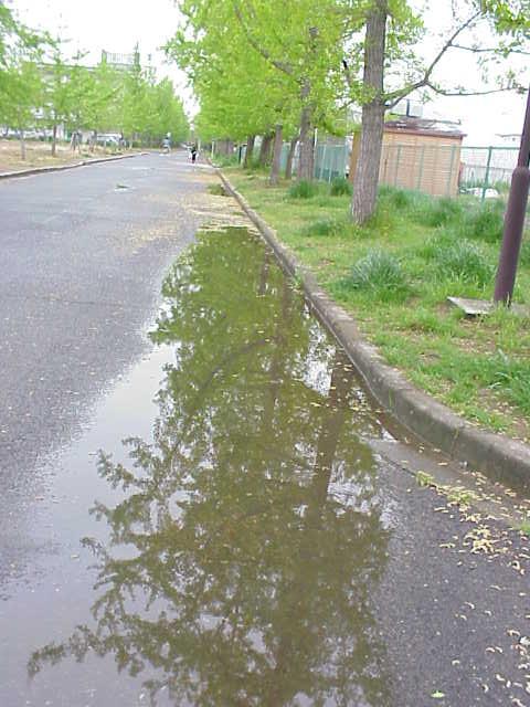 岡山市内では月曜午後から水曜昼にかけてまとまった雨が降った。雨上がり、水たまりにうつった新緑の木々を眺めるのも楽しいものだ。写真左は、文法経グラウンドから眺める半田山。写真右は、農学部東西通りの銀杏並木。 |