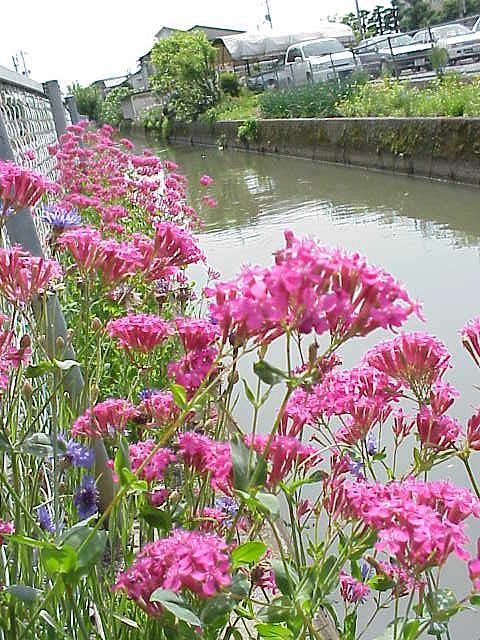 座主川(旭川からの用水)沿いに咲くムシトリナデシコ。別名ハエトリナデシコ、英名は「garden catchfly」という。大学構内では野生化している。小町草(コマチソウ)という呼び名もあるが、私の身近なところでは使われていないように思う。 |