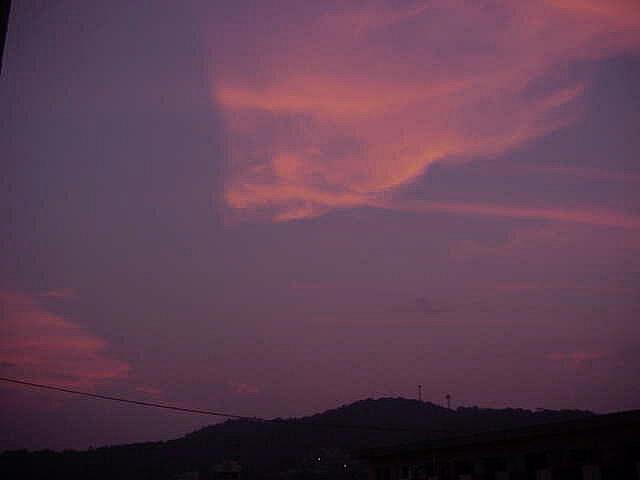 7/29の夕刻、西の空の雲の上に道路のような黒い筋が入っていた。ちょうど、日の沈む方角に大きな積乱雲があり、その影が雲の上に投影されたものと思われる。右は、影の境界にラインを入れて見やすくした写真。 |