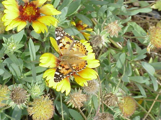 | 羽根の模様はツマグロヒョウモンの雌にそっくりだが、大きさが一回り小さい蝶を見つけた。図鑑によればヒメアカタテハ。花はテンニンギクの黄花。 |