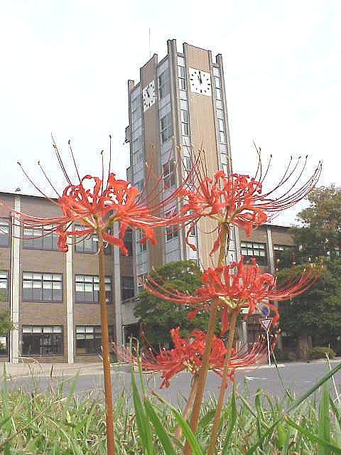 | 日曜日、時計台前の芝地で彼岸花を見つけた。秋のお彼岸にきっちりと開花するという規則正しさに驚かされる彼岸花であるが、ここに咲いているものは10日以上の遅れ。それと、昨年まで生えていなかった場所に突然出現したというのも謎である。 |
