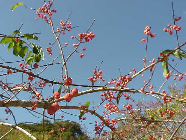 | マユミの赤い実。この木の名前「真弓」は、枝がよくしない、弓の材料に使われたことに由来するとか。 |