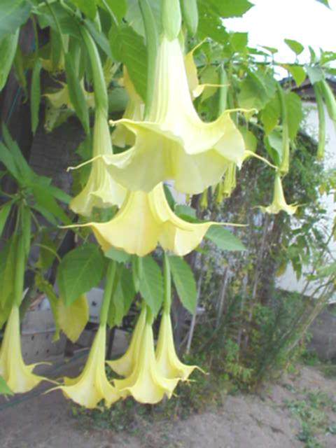 | エンゼルトランペット。7/17の日記に一番花が7/16より咲き始めたとの記録がある。本格的な秋の訪れを前に、最大の見頃を迎えた。この植物は、露地では霜にあたると茎を含めて全部枯れてしまうが、株はちゃんと残る。根が張ってきたためだろうが、年々、たくさんの花をつけるようになってきた。 |