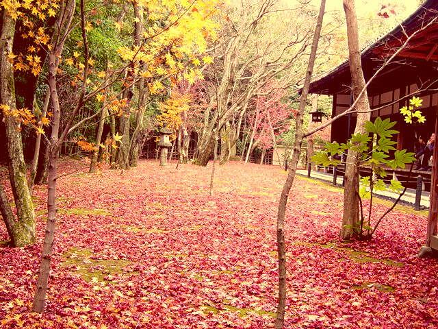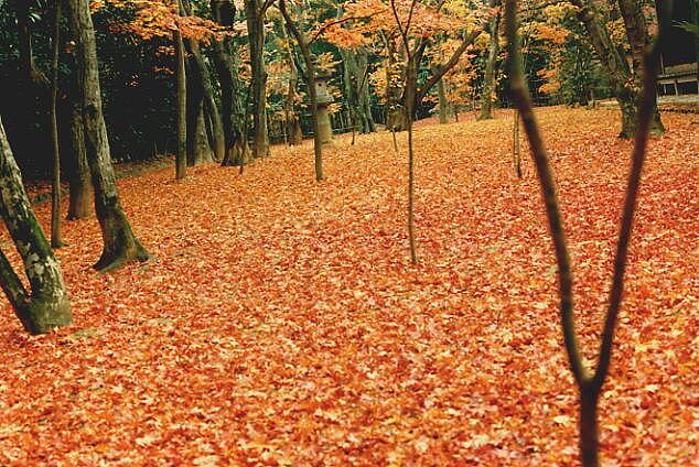 京都・大徳寺・高桐院の庭。モミジの絨毯を期待していたが、すでに落ち葉が色あせてしまい、時機を逸してしまった。右の写真は1979年12月上旬に撮影した最高(←じぶん比)の写真。やや角度が異なっているものの、23年前に写っていた木々をいくつか同定することができる。