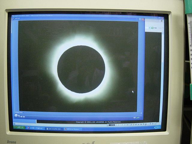 ライブ中継で眺める皆既日食と、全身で受け止める皆既日食 夕刻、他の方のWeb日記にオーストラリア等で見られる皆既日食のライブ中継のことが書かれてあった。すでに外は真っ暗になっており、オーストラリアは日本と経度が同じだからもう終わってしまっているに違いないと思ったが、念のためリンクをたどってみると、日本時間で18時10分台であることに気づく。おかしいなあと思ったが、よく考えれば現地はいま夏至に近い。まだ日没には間があったのである。 さっそく、ライブ中継サイトに繋いで日食の様子を眺めた。直前に何度か雲で隠されヒヤヒヤしたが、皆既食が始まる直前からは雲も切れ、皆既食終了までのすべてを眺めることができた。中継担当者は知らなかったのだろうか。セッティングの会話が聞こえ、逆に臨場感をもたらしていた。今回は皆既食継続時間が32秒と比較的短かったが、そのぶん、すれすれに隠された太陽の縁から全方位に向かってプロミネンスが見えたらしい。いままでで一番美しいとの声も聞こえてきた。 これまでライブ中継などというと、ネットが混雑していてどうせアクセスできないだろうとか、途中で切断されてしまうだろう、などとの思いこみがあり、滅多に利用したことがなかったが、こんなに身近に利用できるとは思わなかった。コロナを眺めるだけだったら、何十万もの旅費を投じて現地に行かなくても済みそうだ。 もっとも、こういった画面いっぱいのコロナを見ても、今ひとつ物足りないところがある。98年8月23日の日記や99年1月14日の日記に書いたように、皆既日食見物の醍醐味は、真っ昼間の景色が急速に暗くなっていく変化にある。皆既日食の瞬間を望遠鏡で眺めるだけだったらテレビやインターネットの画像でも大して変わりはない。写真なども他の人の撮影したものを見せてもらえば済む。しかし、大空全体を肉眼で見渡すことは、現地に行かないとなかなか体験できない。 上掲の右の写真は、小笠原沖の皆既日食の時に20mm広角レンズで撮影した写真である。太陽が真上にあったため2枚を合成してみたが、日食の最中のだいたいの雰囲気はこれで伝わると思う。天頂付近は、コロナを輝かせる太陽と金星や水星などの内惑星、水平線はどの方角も夕焼けのように赤く染まる。私が見たいのは、こういう空いっぱいの景色であって、拡大されたコロナの写真ではない。天文現象を全身で受け止めるには、対象となる天体だけに目を向けていてはダメだ。空全体や地上(海上)全体の中で感じ取る必要がある。できればこういう、現地の景色全体のライブ中継を実現してもらいたいところだが、どんなもんだろうか。 ヘールボップ彗星が近づいた時も、私は、彗星の拡大写真よりは、見慣れた風景と彗星との組み合わせに関心があった。チベットで花の写真を撮る時も、接写よりは、周囲や遠くの雪山を背景に入れたほうが面白いと思う。これは人間の行動についても言えることだろう。1つの行動だけに目を向けるのではなく全人的にとらえるということ、分析ばかりでなく全体や関係性を重視する必要があるということを強く感じるこのごろである。 |