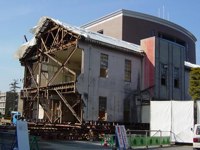 岡大の旧事務局[旧日本軍第17師団(大正14年廃止)司令部・歩兵第33旅団司令部]の一部の移送が始まった。写真左は1/8朝撮影。右は1/9の昼食後に撮影。このように老朽化した木造建築物を丸ごと動かしてしまうとは、日本の技術もスゴイもんだ。 |