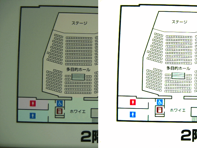 夏に開催予定の行動分析学会年次大会の発表論文集を編集している最中であるが、会場の50周年記念会館の館内案内図が入手できず困っていた。事務室には手書きの図面しか用意されていないというのである。 ところがふと玄関を見ると、プラスチック製の案内板がちゃんと設置されているではないか。さっそくデジカメで撮影したのが写真の左半分。それを色調補正(レベル補正)したのが写真右半分の図面である。補正後の図面を試しに印刷してみたが、印刷用図版として十分使えることが分かった。ずいぶんと便利になったものだ。 こちらが完成した図版。 |