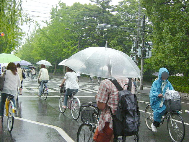 こういう時、傘をさしながら自転車に乗っている風景をよく見る。雨具を着ている人はおそらく1%にも満たない。山登りに使うような通気性のよい雨具ならともかく、ただの防水雨具では蒸し暑くてやってられないからだろう。 とはいえ、片手で傘を持つとブレーキ操作が半分しかできず随分と危険になる。じっさい、私が小学生の頃は、よいこのお約束として、「傘をさしながら自転車に乗ってはいけません」と言われた。大きな事故が起こる前になんとかしなければ、と思う。 6/22の「お互い更新日記」に書いたことがあるが、最近は全天候型自転車【2008.1.15.リンク先修正】というのがあるらしい。これだけ毎日のように雨が降るならばけっこう便利かと思う。 もっと簡便なのが、成都で見た傘取り付け金具である。成都ではもっぱら日よけ傘として使われていたが、それなりに雨よけになると思う。手で傘を持つよりは安全ではないかと思う。前にも書いたことがあるが、こういう便利な金具が日本で普及しないのはなぜだろうか? 道路交通法で禁止されているからなのだろうか? 現代人は下を向いて歩く? 6月27日22時台のNHKニュース10によると、最近は「猫背」の人が増えているという。ある調査では「自分の姿勢が悪い」と答えた人が51%、ほかに、若い女性に猫背が多いという調査結果もある。 心理学が専門の渋谷昌三先生(目白大)によれば、姿勢は感情を反映し、気持ちが落ち込んでいる時は下を向くようになるという話だったが、どんなもんだろうか そりゃ、同じ人間であっても、気持ちが塞いでいる時は周りの景色などどうでもよくなるものだ。簡単な実験や測定をすれば、気持ちと姿勢の間に多少の相関は出てくるかもしれない。例えば、阪神が対横浜戦14連勝を遂げたあとに出てくる阪神ファンと横浜ファンの姿勢を観察すれば、多少は、顔の向きが変わっているかもしれない。 しかし、ここで言われている「姿勢」というのは、もっと固定的なクセであって、感情と関係の無く、生活習慣によって形作られるものではないだろうか。 ネットでいくつか検索してみたところこちらには「テレビゲームの普及などで幼いころから外で遊ばなくなり、筋力が低下してきたことが最大の原因でしょう」という推察があった。目がテンでも取り上げられたことがあったようだ。こちらではテーブルと椅子の関係が指摘されている。 これ以外に都市空間では、上よりは下を向いて歩いた方が安全という条件づけも起こっているように思う。たまに上京した時など思うのだが、動く歩道や電車のドア位置など、足元を見ていないと迷うことが多い。 私自身はどうかと思ったが、朝の散歩時はほぼ水平方向を眺めている。冬場はまだ星が見えているので、上を向くことのほうが多いかもしれない。 |