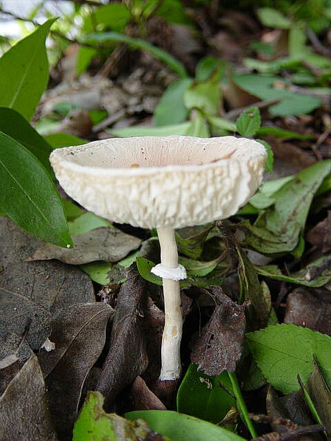 | 岡大東西通りの植木の下で見つけたキノコ。コタマゴテングダケの傘が開いたようにも見えるが、こんなところに生えるとは?? |