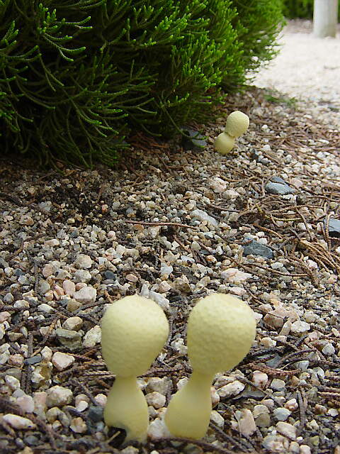 アパートの下で、こけしそっくりのキノコを見つけた。もののけ姫に出てくる「こだま」のようにも見える(7/10撮影)。もっとも翌日(7/12)には傘が開いて普通のキノコに近くなってしまった。