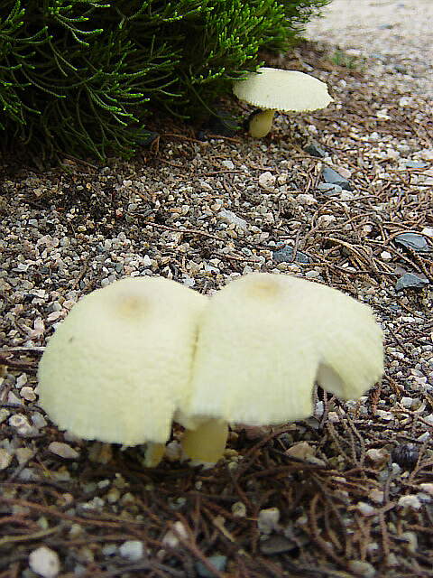 あたりをみると、カイヅカイブキの株の周りに菌輪ができていた。図鑑で調べたところ、コガネキヌカラカサタケに近いようだが、以前に大学構内で撮影した写真と比較すると色や傘の形が微妙に違うようだ。 |