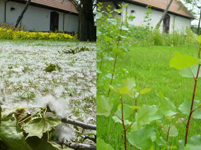 | いろんな犬を撫でてみたいという娘のリクエストに応じて「わんわん牧場」のあるドイツの森へ。私自身は犬には触らず、「ベルク(村)」のベンチで本などを読んで過ごした。5月17日に訪れた時には、ベルク一帯はポプラの綿毛でうっすら「雪化粧」していた(写真左半分)。2カ月ぶりに見たのが写真右半分の景色。綿毛の一部が芽を出し、こんなにも成長していた。 |