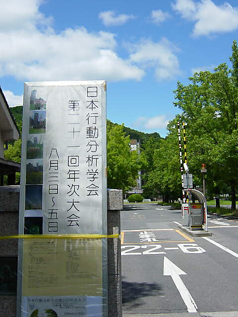 時計台前の門柱(岡大西門)に、学会年次大会の看板を立てた。アルバイトに頼む資金が不足していたため自分で貼り付け。このことで初めて知ったのだが、一太郎ナビには「垂れ幕」という機能があり、A4用紙を貼り合わせて看板を作る際に大いに役立つことが分かった。