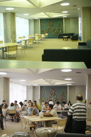 | 行動分析学会年次大会の会場となった岡山大学創立五十周年記念館の1階ロビー。写真上は準備前、写真下は、開会中の風景。大型の丸テーブルと椅子を移動し、座る場所を確保しておいたよかった。後かたづけ後はまた、写真上と同様の静けさが戻る。 |