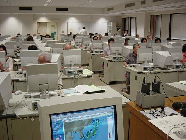 | 公開講座(午前の部)の風景。防災情報のレーダー画面をモニターに映し台風の雨雲の様子をチェック。この防災情報サイトは、6/12より運用開始されたものであるが、本格的な台風の雲を映し出したのは、これが初めてではないかと思う。各所で防災に役立てられたはずだ。 |