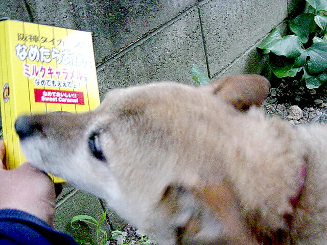 先日の学会年次大会の時に、「なめたらあかん」というミルクキャラメルの差し入れがあった。借りている畑の隣にいるわんこに空き箱をみせたところ、ぺろぺろと舐めた。