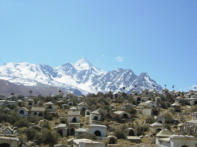| ボリビア・アンデスのワイナポトシ6088mをのぞむ墓地。標高は4500m〜4800m。日本の富士霊園のようなロケーションか。 |