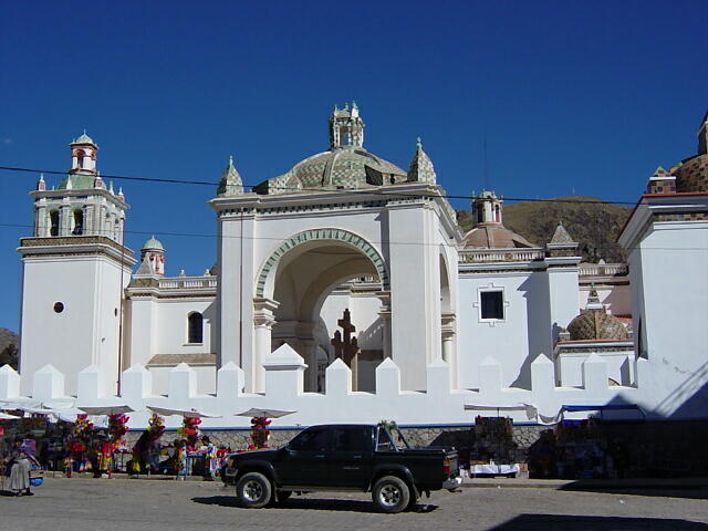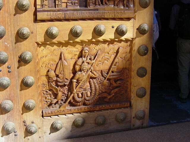 チチカカ湖畔のコパカバーナの教会。門前にはおみやげグッズを売る露店が並ぶ。教会のドアには、葦船でやってきたマリア様の彫刻があり。
