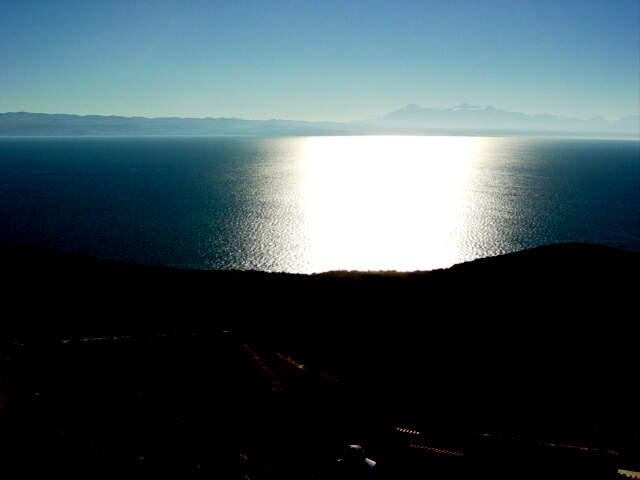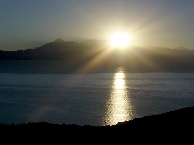 チチカカ湖・太陽の島から眺めた「光の道」。日の出直後に対岸のアンデスの山々からこの島に向かって一直線の光のスジが走った。太陽の島の名にふさわしい光景であった。日が高く昇るにつれて、道の幅は広がり(写真右)、やがて消えていった。