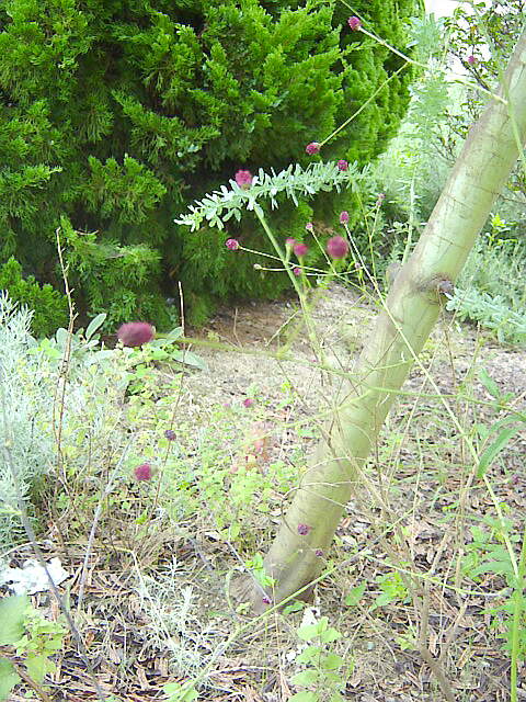 | ワレモコウ。10年近く前に植えたものだが、暑さと湿気のせいだろうか、毎年、花が咲く頃に白いカビのようなものがついてそのまま葉を落としてしまった。今年もその気配はあるものの、初めてちゃんとした花をつけた。 |