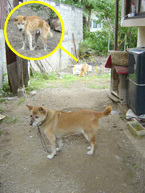 (借りている畑の)隣の家で飼っている「わん子」の様子が変なので見に行ったら、なっなんと、野良犬が迷い込んでいた。よく見るとオス犬である。「わん子」はメス犬なのだ。かなり心配。もっともこの野良犬、毛並みが悪い上に後ろ足がヨタヨタしており、目は殆ど見えていないようだった。気の毒ではあったが、敷地の外に追い出した。