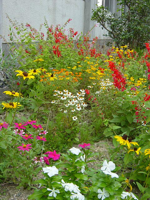 | 文法経三学部講義棟前の花壇。この花は全部私が植えたものだが、そのことは余り知られていないようだ。全く手間のかからない、ありきたりの花ばかりだが、これでも後期の授業開始にちょうど見頃となるように配慮したつもり。 |