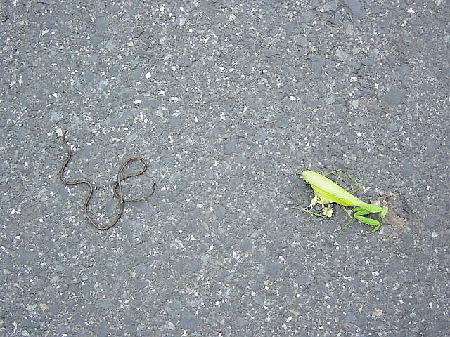 | この時期、アスファルトの道路で一番よく見かけるのが、車に轢かれたカマキリである。他の昆虫と違って何物をも恐れないため、事故に遭いやすいのだろう。カマキリの死骸のすぐ横には必ずといってよいほど、ハリガネムシがのたうち回っている。寄生率100%といってよいのではなかろうか。これって、どうやって冬を越すのだろう。 |