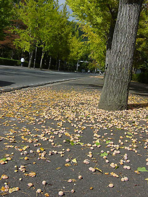 | 岡山では23日、木枯らし第一号と呼べるような強い風が吹いた。南北通りのギンナンが大量に落ちて絨毯模様となっていた。 |