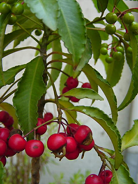 | 鉢植えの万両が今年も実をつけた。果樹と同様、実の多い年と少ない年を1年おきに繰り返していたが(1999年12月12日の日記など参照)、今年はなぜか昨年来の実が落ちずに残り、二世代の実をつけた。昨年来の実のほうは、なんと、枝についたままで発根している。 |
