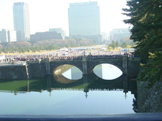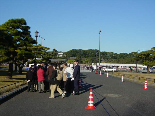 参賀広場でも驚いたことがいくつかあった。皇居の中であるからには、大理石が敷き詰められた立派な広場かと思いきや、コンクリートの板が敷き詰められている程度で、ところどころ欠けたり、はげ落ちたりしていた。写真左に移っているパイプは、参賀の最前列の手すりをささえる足場と思われたが、これもまた道路工事現場なみの貧相なもので所々さび付いていた。