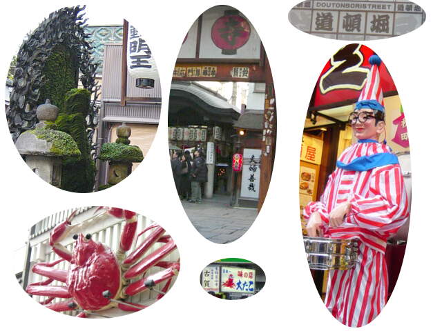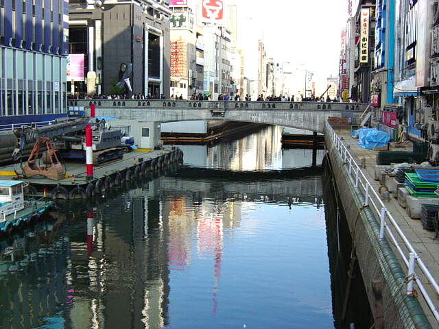 大阪・道頓堀界隈。タイガース優勝で「有名」な戎橋。現在工事中であり、飛び込み阻止の対策がとられる模様。写真右は、道頓堀の名所・名物いろいろ。下の記事に書いたように、カーネル・サンダースはここには存在しなかった。